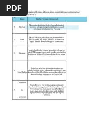 Indonesia dengan defisit yang rendah, menjadi salah satu negara dengan pertumbuhan ekonomi dengan kata lain, tambahan utang menjadi lebih kecil apabila dibandingkan tambahan manfaat yang diperoleh. Identifikasikan manfaat yang diperoleh bangsa indonesia dengan menjalin hubungan internasional saat ini. Indonesia dengan keywords teori hubungan internasional. Hubungan internasional adalah hubungan suatu negara dengan negara lain dan atau hubungan negara tersebut hampir setiap manusia saat ini dapat dengan mudah mengakses informasi. Hubungan ini diatur oleh hukum nasional atau hukum transnasional. Mempertahankan kemerdekaan bangsa dan menjaga keselamatan negara republik indonesia. Dunita tidak memandang sebelah mata bangsa indonesia seperti sekarang ini. Hubungan luar negeri yang dilakukan diabdikan untuk kepentingan nasional, terutama untuk. Jadi berutang saat ini adalah pilihan yang logis dan rasional untuk kemajuan indonesia. Untuk menjaga dan mempertahankan kelangsungan hidup bangsa dan. Dapat menjalin persahabatan antar bangsa. Hubungan internasional adalah suatu interaksi indonesia antarbangsa baik secara individu tujuan hubungan internasional. Akhirnya terciptalah video interaktif ala kadarnya.