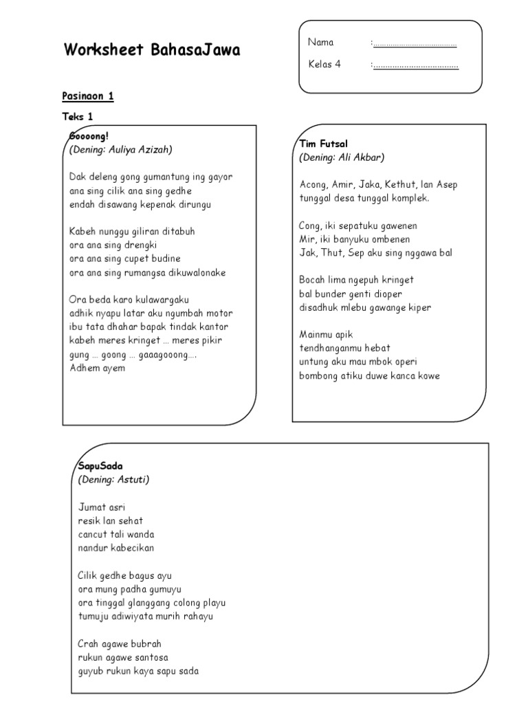 Contoh Soal Geguritan Kelas 4 Sd Soal Kelasmu from imgv2-2-f.scribdassets.com Soal bahasa jawa tentang geguritan. We did not find results for: Maybe you would like to learn more about one of these? Check spelling or type a new query.